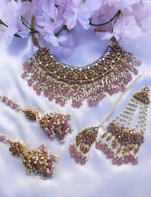 • This intricately designed set features delicate pink stones and comes with a necklace, earrings, and tikka for a complete bridal look.