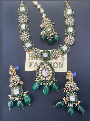 Kundan set is a traditional Indian necklace known for its intricate craftsmanship and rich history. Originating from the royal courts of Rajasthan and Gujarat, Kundan jewellery is renowned for its elaborate designs and use of precious stones .