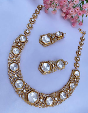 A Moissanite set typically refers to a jewellery ensemble featuring moissanite, a gemstone known for its brilliance and fire. This stunning moissanite jewellery set showcases the extraordinary brilliance and fire of  moissanite stones, which are second only to diamonds in hardness and sparkle. Each moissanite stone is of the highest quality , exhibiting exceptional clarity , colour, and cut to maximise its brilliance .