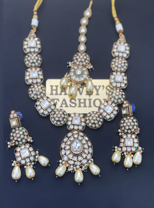 Kundan set is a traditional Indian necklace known for its intricate craftsmanship and rich history. Originating from the royal courts of Rajasthan and Gujarat, Kundan jewellery is renowned for its elaborate designs and use of precious stones .