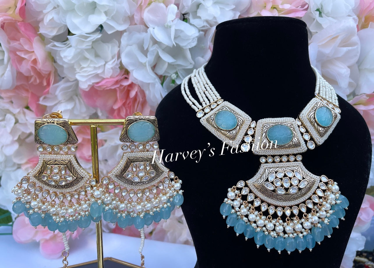 Heavy Kundan Sky Blue Necklace Set