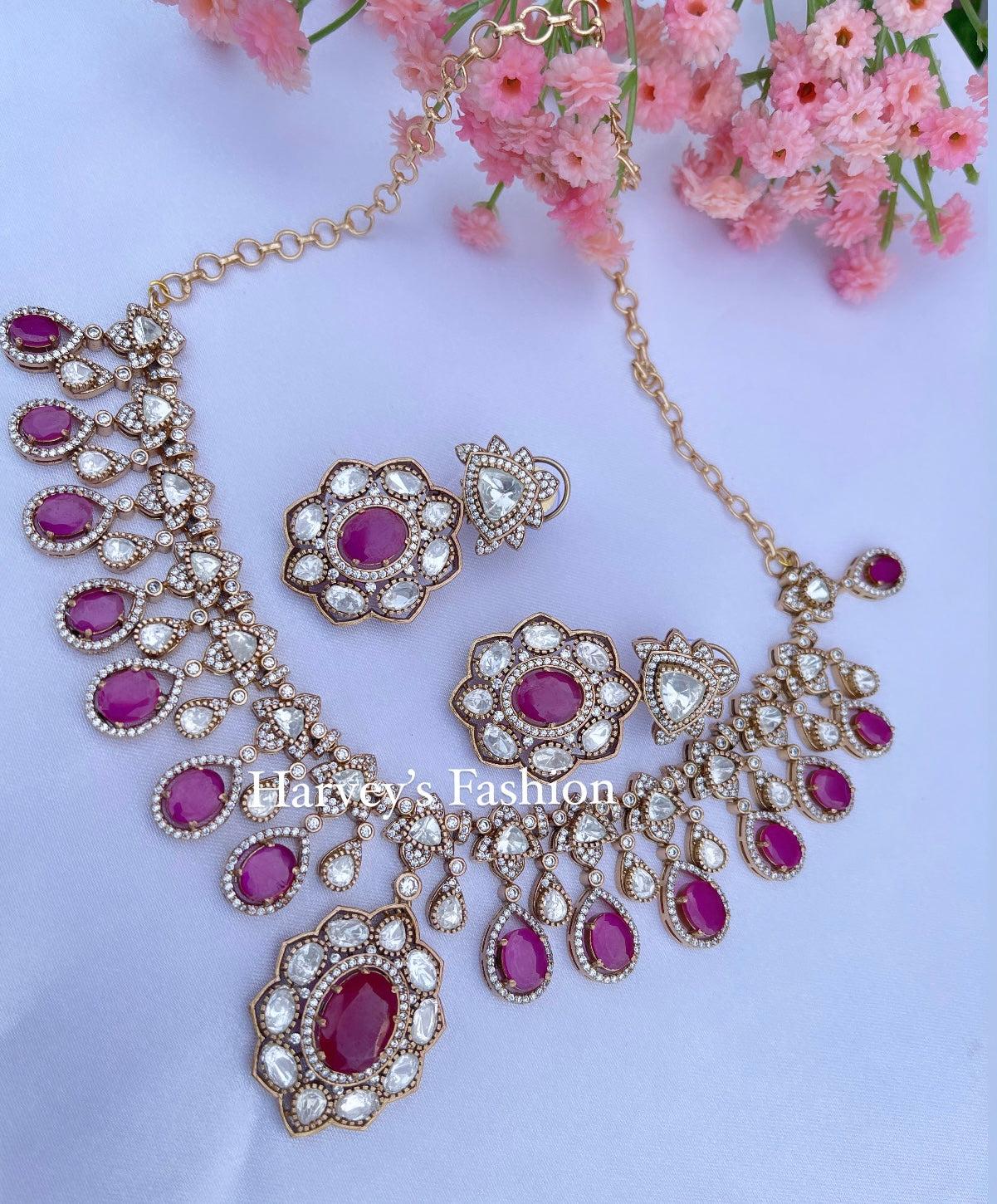 Sarv Moissanite Kundan Ruby Pink Necklace Set