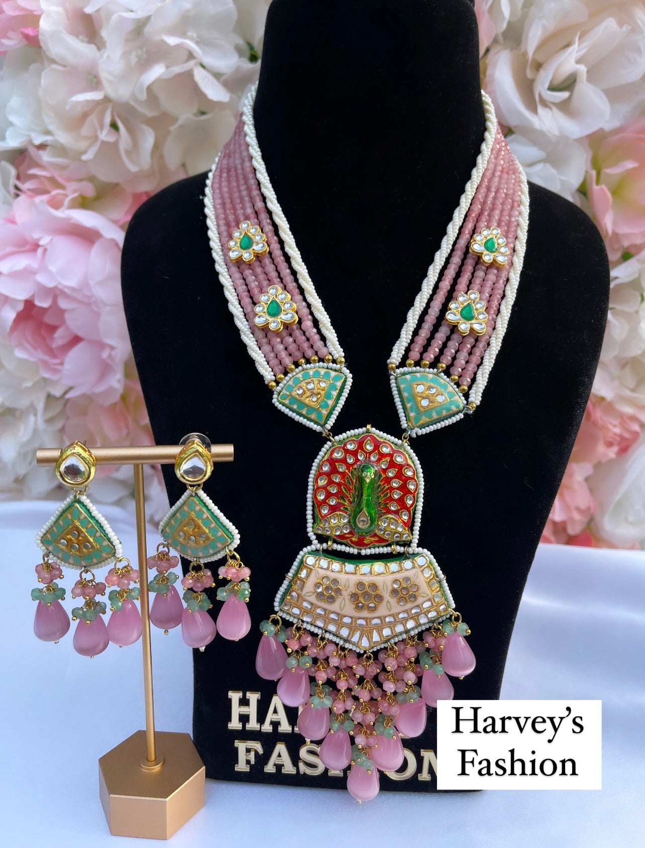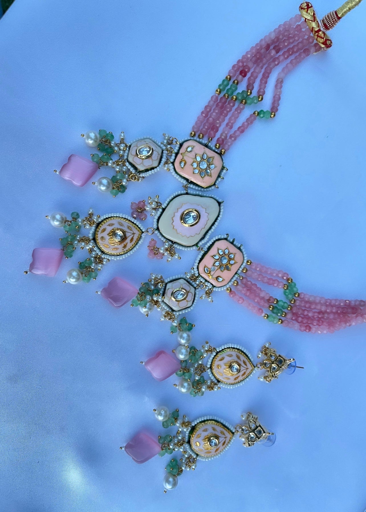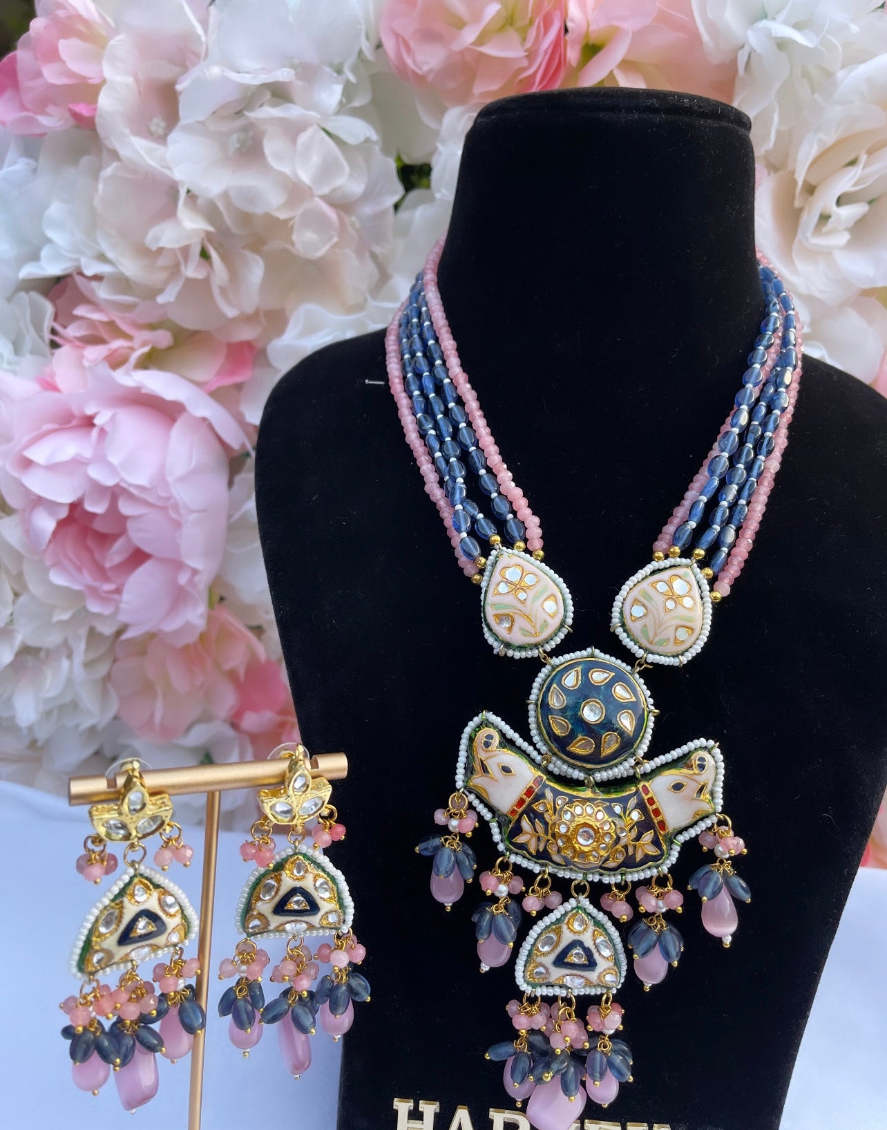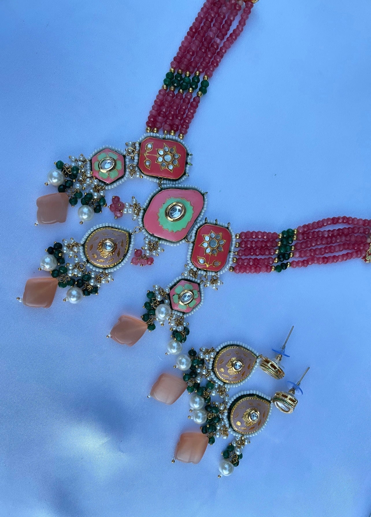 Mala Hand-Painted Pink /Blue Beads Necklace Set