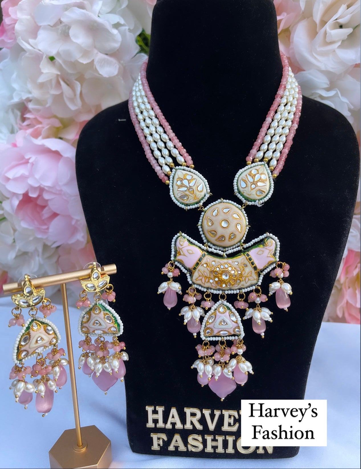 Mala Hand-Painted Pink/White Beads Necklace Set