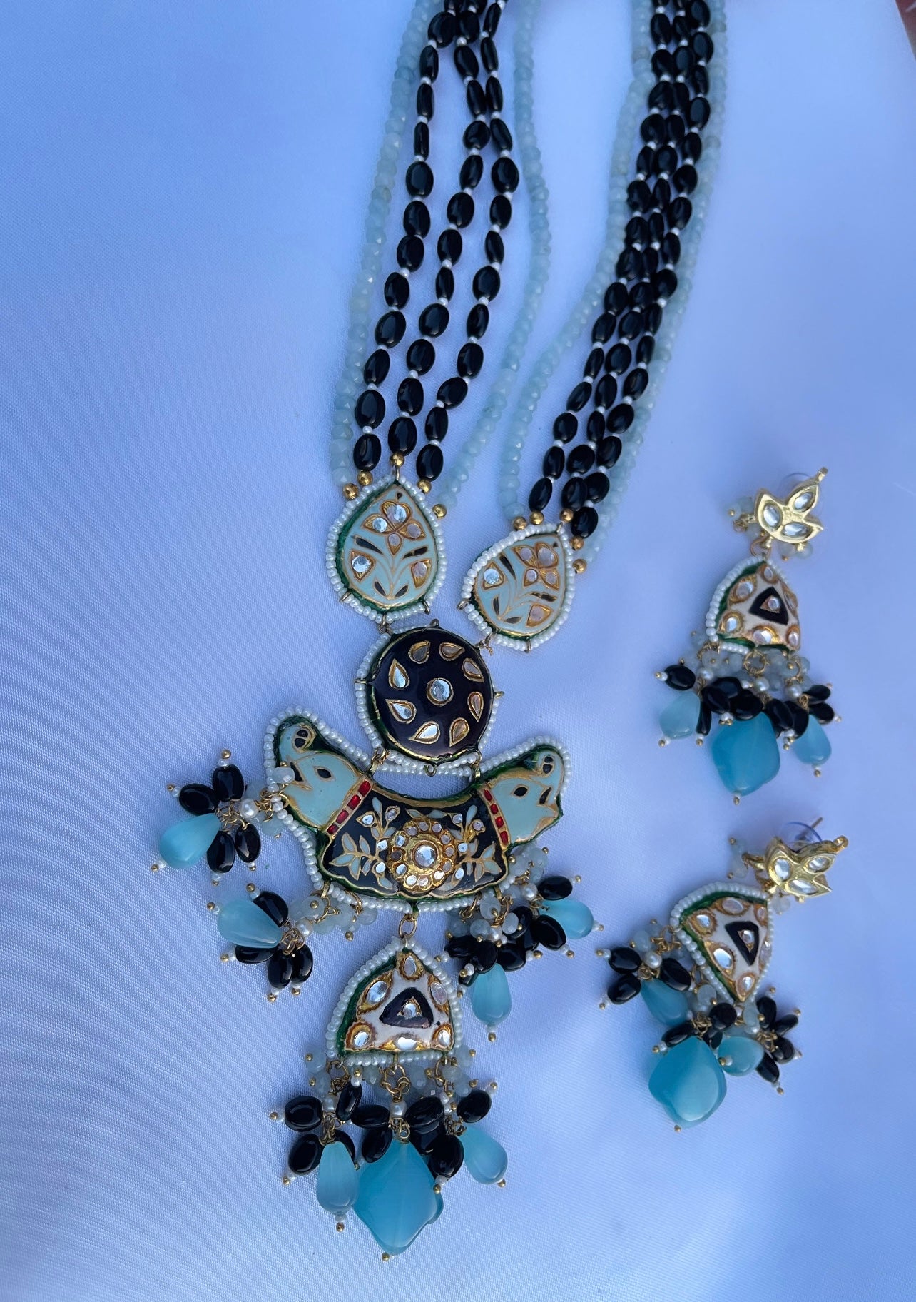 Mala Hand-Painted Black /Light Blue Beads Necklace Set