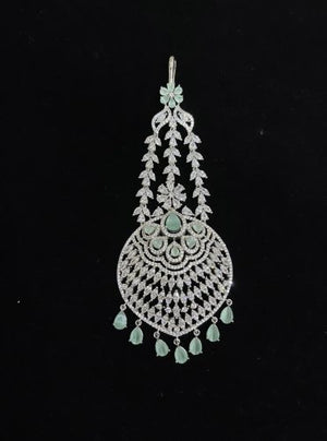 Make a statement with this stunning and unique Mint/Silver American Diamond Jhumar. Accented with mint and silver-hued American diamonds, this headpiece radiates sophistication and style. The mint-colored stones offer a cool burst of color while the silver settings and accents create an elegant complement.
