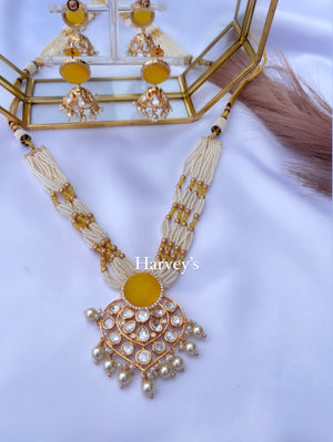 Featuring vibrant yellow gemstones, uncut Kundan design, and exquisite craftsmanship, this versatile set includes a necklace and earrings that coordinate for a complete look. Perfect for special occasions or everyday wear, the Ahana Yellow Uncut Set brings an element of elegance and tradition to any outfit.