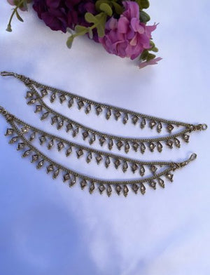 This stunning Gill Saharey accessory is sure to turn heads with its intricate patterns and dazzling gemstones. Every detail is crafted with care, from high-quality materials to skillfully polished metals. For an effortlessly elegant, eye-catching look, the Gill Saharey ear chain is a must-have. This ear chain dazzles with a mesmerizing design and sparkling gemstones that catch the light and catch the eyes. It's intricate patterns and delicate craftsmanship showcase a stunning visual impact that makes a standout statement. Features