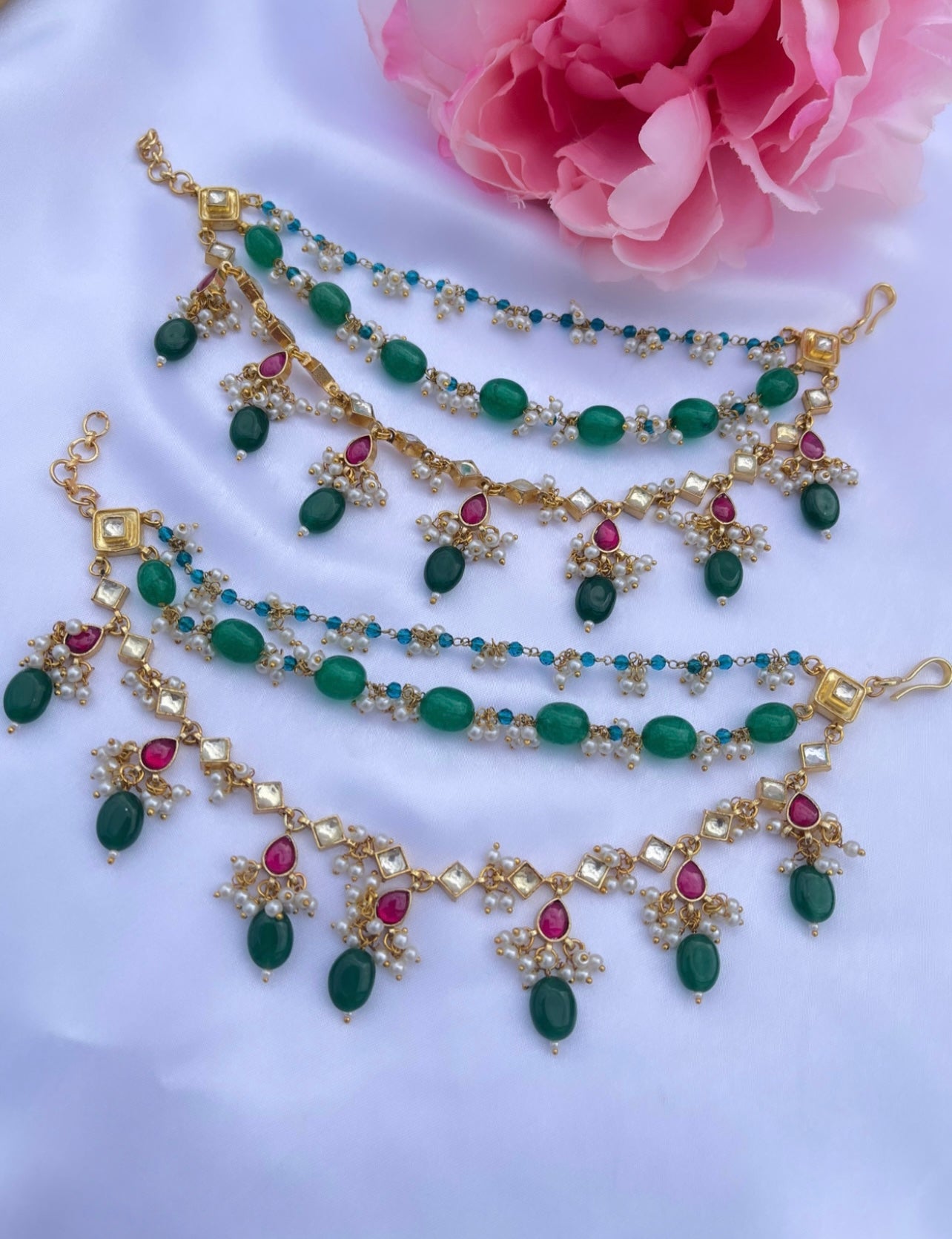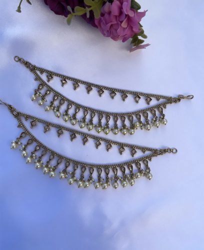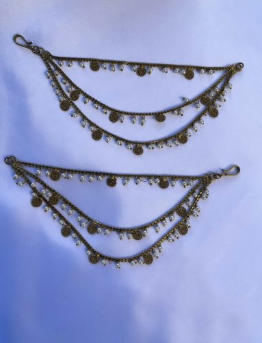 Step up your jewellery game with this beautiful and unique SAHAREY / EAR CHAIN from Harveys Fashion House. Whether you are dressing up for a special occasion or just want to add some sparkle to your daily ensemble, these jewellery pieces will make you feel elegant and sophisticated. These can be worn alone or with other jewellery pieces to create a layered look. This high-quality accessory is sure to turn heads with its intricate detailing such as beads, stones, or pearls, and is perfect for accessorizing an Indian outfit. These ear chains are available in a variety of styles and designs to complement any outfit. It is often adorned with beautiful and intricate detailing such as beads, stones, or pearls. Made from high-quality materials for durable and long-lasting wear. Enhance your look with this timeless piece and pair it with other jewellery pieces for a layered effect. Get yours now for some stylish sparkle! Make it part of your collection and cherish it forever. It will make a great gift for friends and loved ones for special occasions like weddings or birthdays, too. Whether you wear it alone or pair it with other jewellery pieces for a layered look, this SAHAREY / EAR CHAIN will surely stand out anywhere you go.