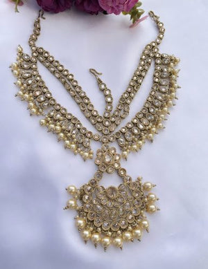 This intricately designed Matha Patti is a vision of radiance that will crown you a queen. Featuring glittering Kundan and Polki stones set in an elaborate filigree pattern, it cascades across your forehead in opulent layers, enhancing your beauty with a touch of bridal elegance. Adjustable to a perfect fit, its regal design evokes the glamor of traditional royalty. Whether gracing your head on your special day or illuminating an evening of celebration, it's sparkling stones and polished precious metals reflect the light and glow of the moment.
