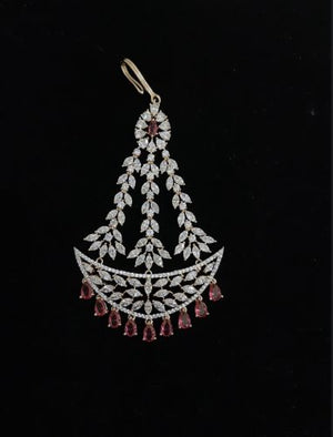 This gorgeous piece brings the perfect blend of classic sophistication and modern sparkle with its intricate design and rich ruby accents. The jhumar and tikka components feature a variety of ruby-colored stones, such as red American diamonds or red crystals, creating a captivating sparkle and adding a vibrant pop of color to your look. Perfect for weddings, festivals, and special occasions, the Manreet AD Ruby Jhumar is sure to elevate your ensemble like no other.